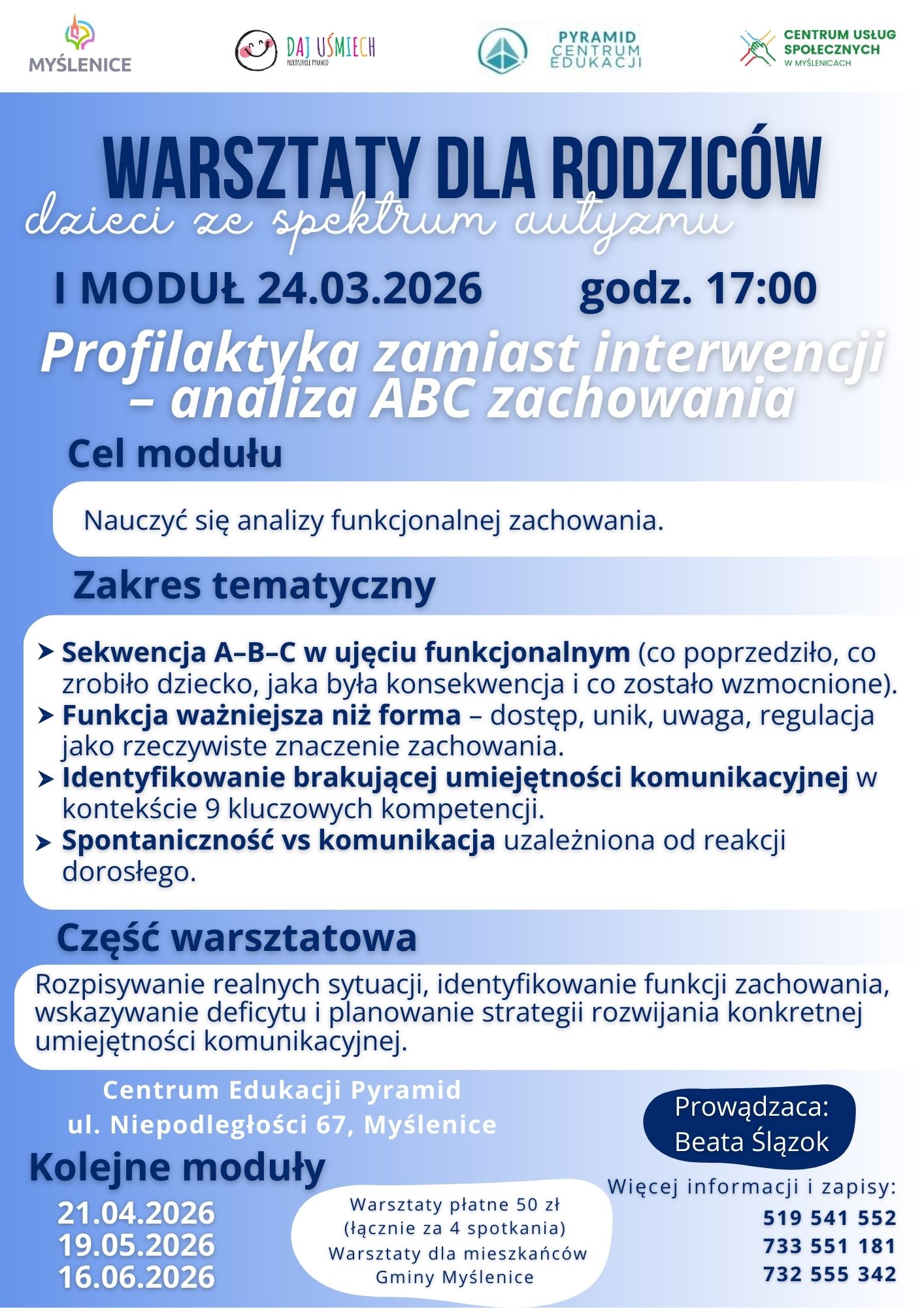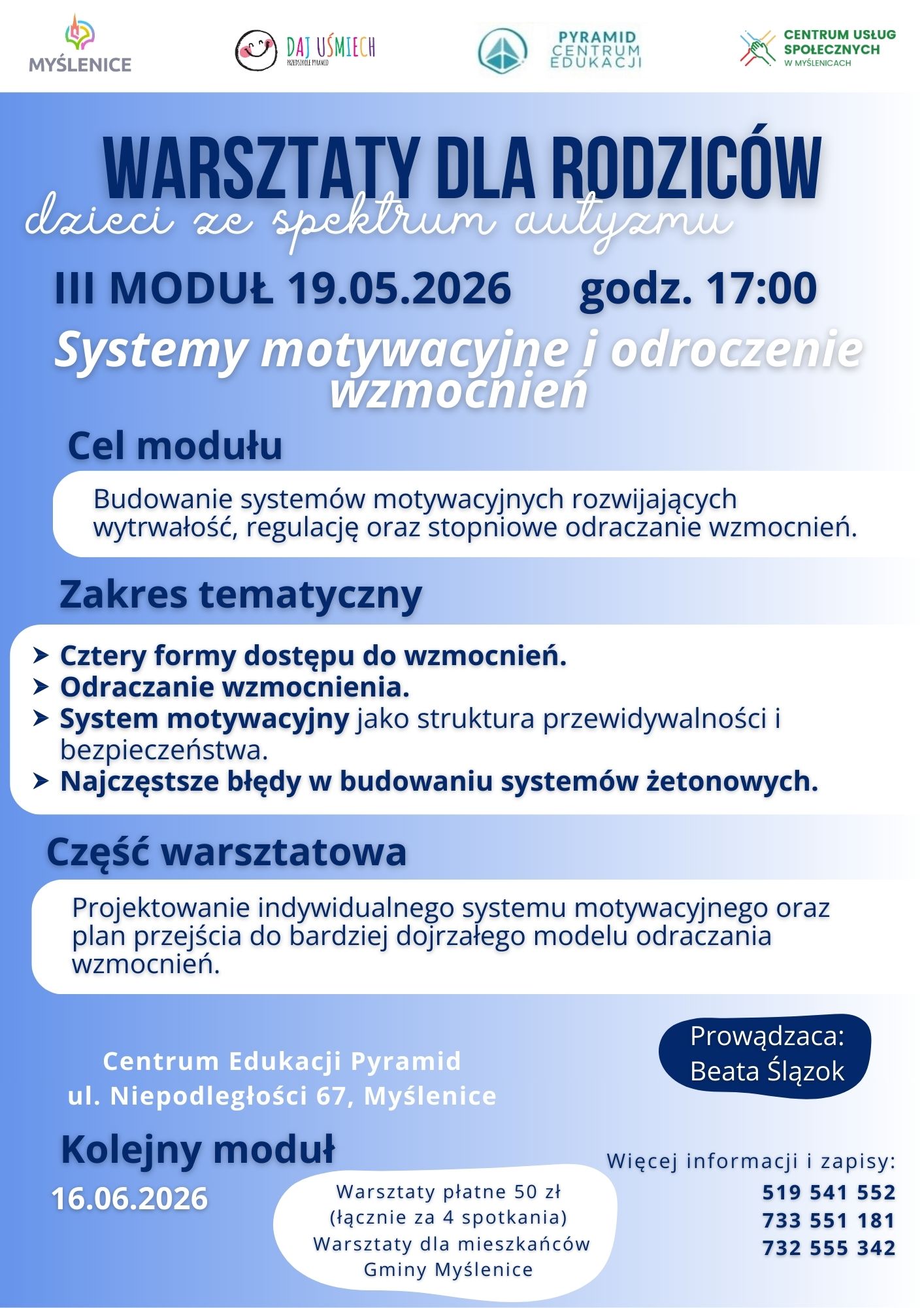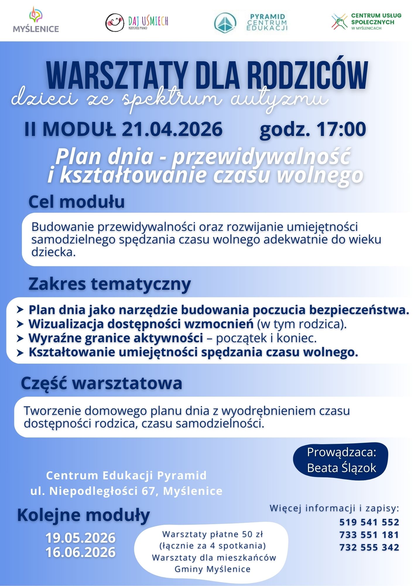 Cztery spotkania warsztatowe poprowadzi pani Beata Ślązok z Centrum Edukacji Pyramid. Szczegółowy program każdego modułu znajduje się na załączonych grafikach.