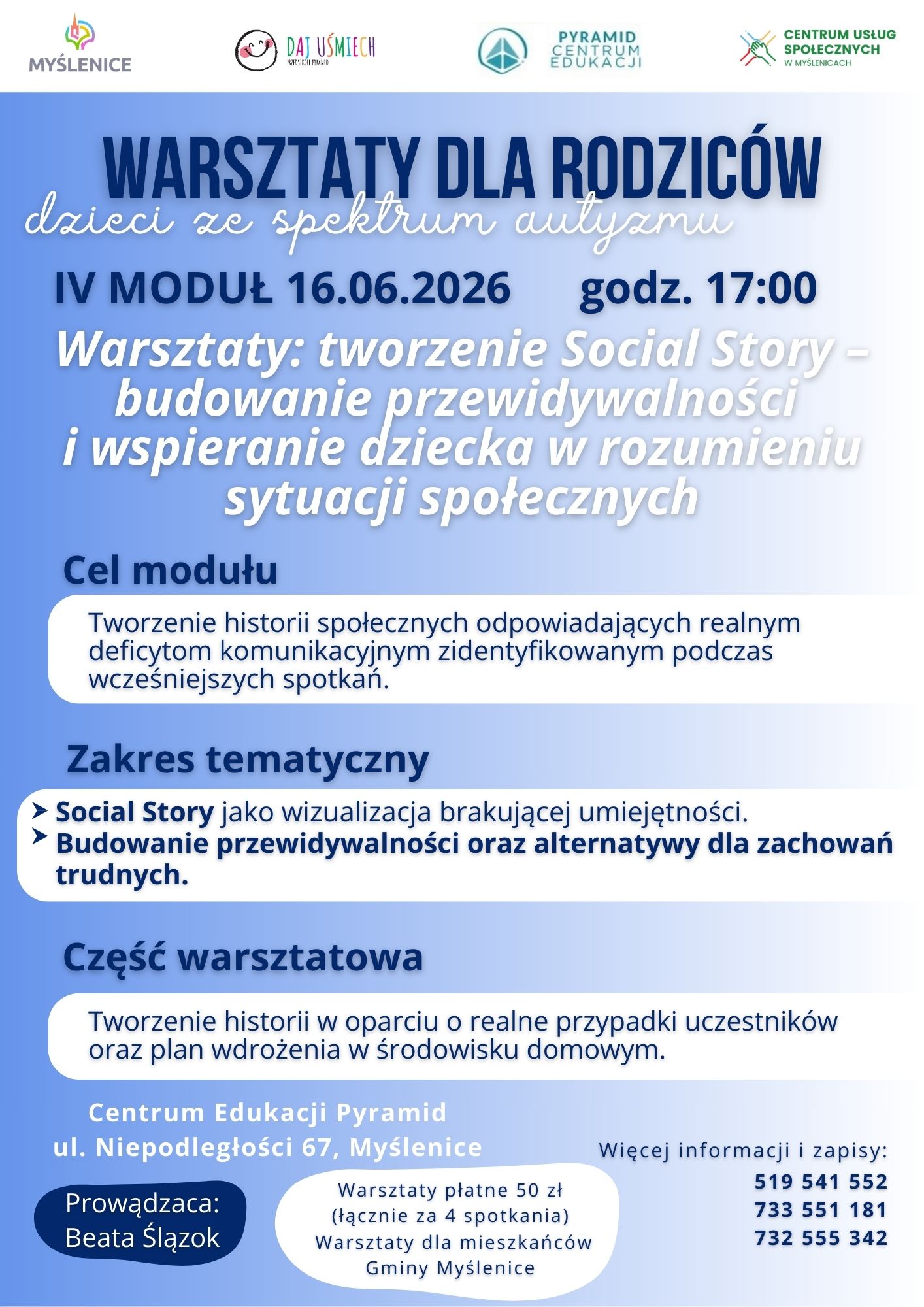 IV MODUŁ16.06.2026 Warsztaty: tworzenie Social Story – budowanie przewidywalności i wspieranie dziecka w rozumieniu sytuacji społecznych